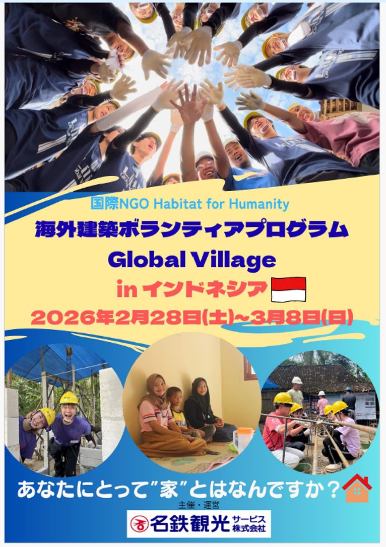 「グローバル・ビレッジ (GV: Global Village)」は、世界70の国で活動する国際NGOハビタット・フォー・ヒューマニティ・インターナショナルが取り組む住居建築支援にボランティアとして参加できる海外建築ボランティアです。GVへの参加は原則チーム単位、派遣される国と時期が決まると、チームで支援地に赴き、ハビタットの一員として現地が取り組む住居建築支援に参加します。そこで、来春、名鉄観光がGV企画を主催、チームを発足しました。GV経験のあるスタッフがリーダー(添乗員)としてチームに同行するので、初めての海外の方も安心して参加いただけます!