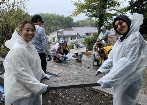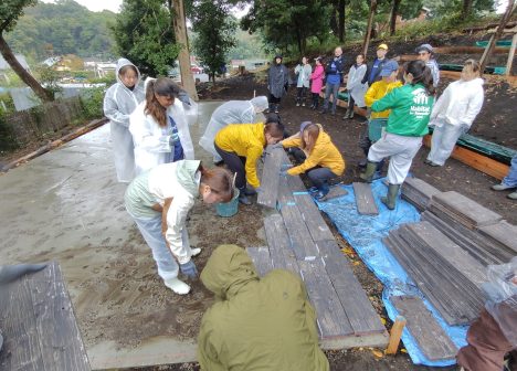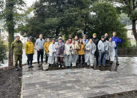 当日はあいにくの天気でしたが、雨と寒さにもかかわらず、皆で協力して活動に取り組みました。ステージ作りは、設置予定のスペースに木目調の石製タイル(約90センチの長さ)を一枚一枚運び、モルタルを塗って貼り付ける作業を行いました。作業は丁寧さが求められるものでしたが、ボランティアの皆さまが互いに声を掛け合い、協力しながら進めてくださったおかげで、予定していたステージの約半分にタイルを貼り終えることができました。