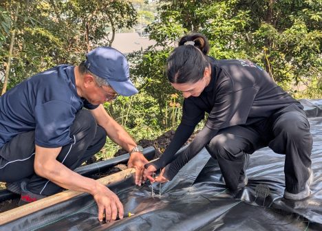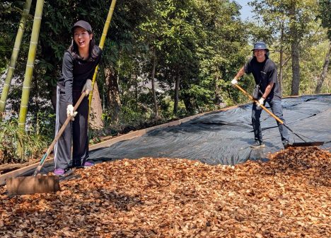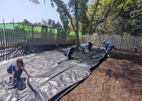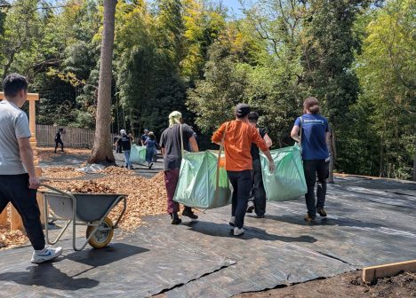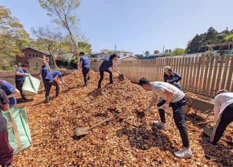 Meanwhile, the woodchips team oversaw bringing the wood chips to the already laid out barrier sheet using wheelbarrows and large sacks. They started by filling the wheelbarrows and large sacks with woodchips from a large nearby pile and then carried them to the already placed barrier sheets. Once the sheets were fully placed around the playground equipment, both teams joined efforts to carry as many wood chips as possible during the volunteer day. By the end of the day the volunteers managed to cover the entire sheet with the first layer of woodchips. The playground area needs to be further covered with all the woodchips to ensure a soft and safe ground for the children and so Habitat Japan will continue to organize volunteer days to finish this until the project is complete.