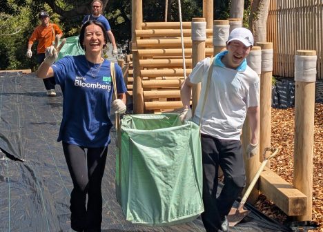 On April 11, following the installation of the playground equipment, a total of 20 employee volunteers from Bloomberg, J.P. Morgan, and DuPont Styro participated in a joint volunteer activity. The playground is located on a hill behind the children’s home in a mountainous area, so to prevent weed growth and ensure safe conditions, volunteers laid weed barrier sheets and spread wood chips around the playground area to create a soft and safe surface for children to play on.
